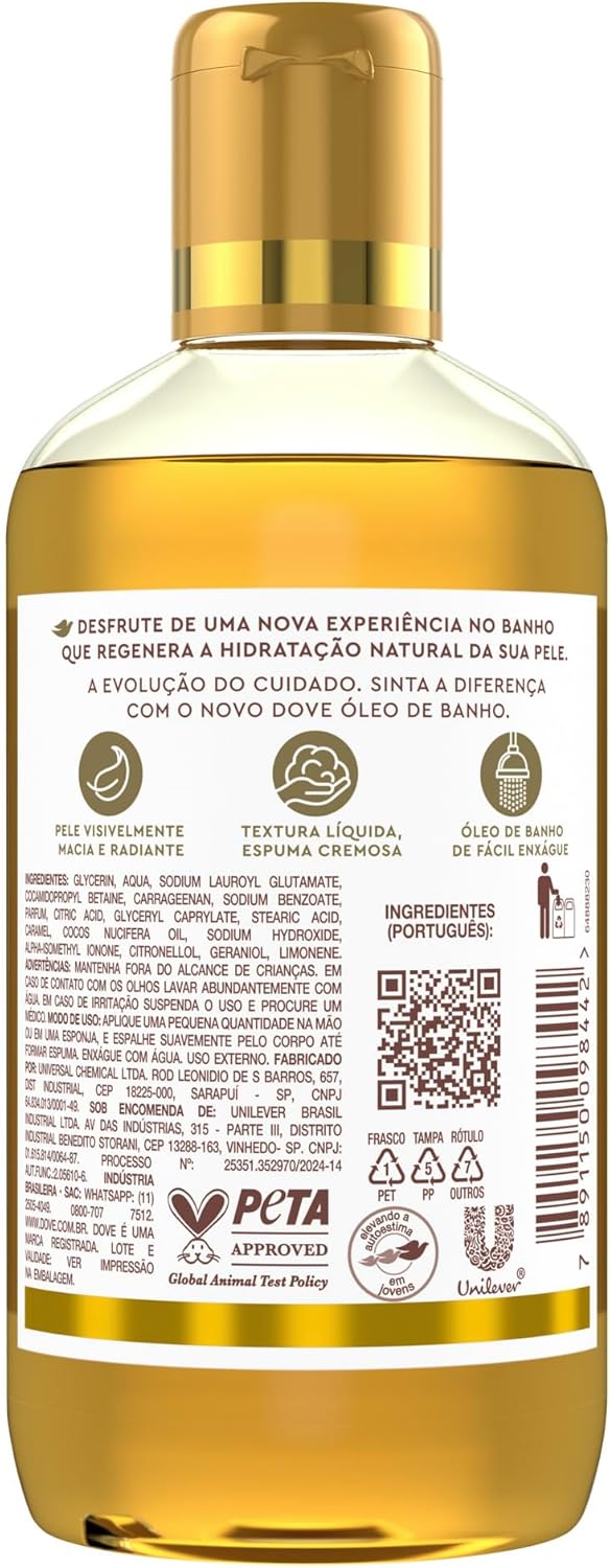 - Além disso, o produto para cuidados com o corpo tem textura líquida, espuma cremosa e enxágue fácil, deixando a pele profundamente hidratada, sem sensação oleosa. Desfrute de um spa em casa com a evolução do cuidado: Dove Óleo de Banho regenera a hidratação natural da pele enquanto envolve seus sentidos com uma fragrância suave e relaxante, podendo ser usado no corpo e rosto