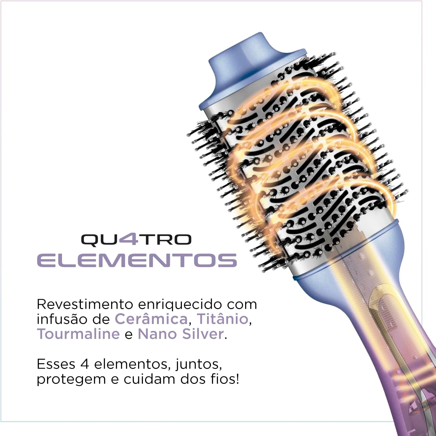 A Escova Secadora da Linha by Juliette Qu4tro Elementos traz um revestimento especial enriquecido com infusão de Cerâmica, Titânio, Tourmaline e Nano Silver. Esses 4 elementos, juntos, protegem seus fios e garantem uma aparência mais saudável aos cabelos, com brilho intenso, maciez e sem frizz. Saiba mais sobre a Escova Secadora ES-JU-03: