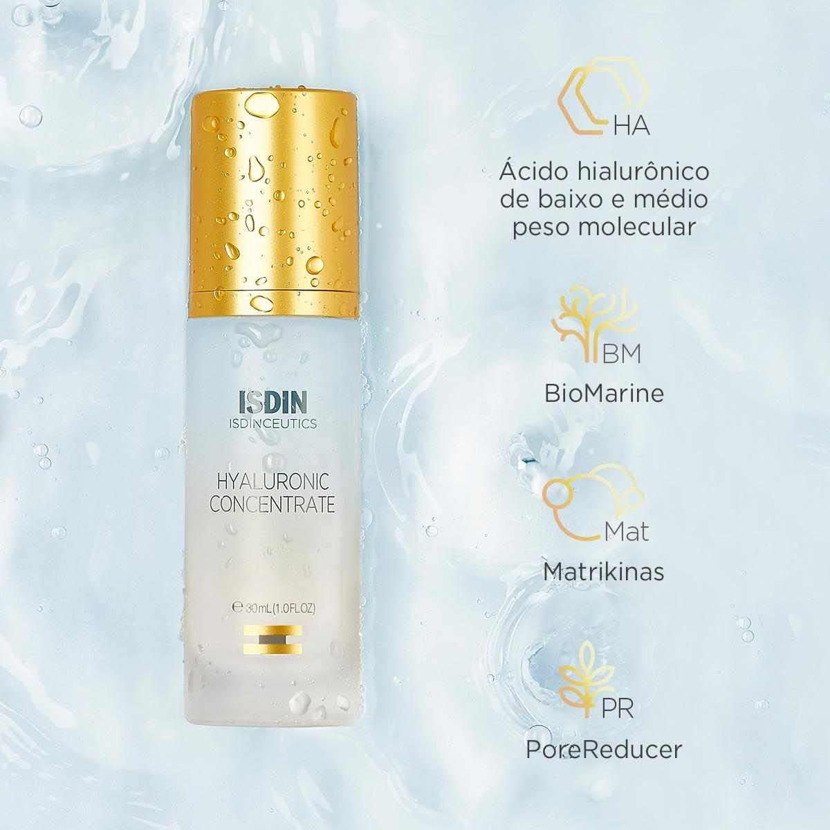 O ISDIN Isdinceutics Hyaluronic Concentrate é um sérum facial anti-idade com 30 ml de produto. Sua fórmula combina ácido hialurônico de baixo e médio peso molecular, extrato de Lens esculenta, Biomarine e matrikinas, proporcionando: