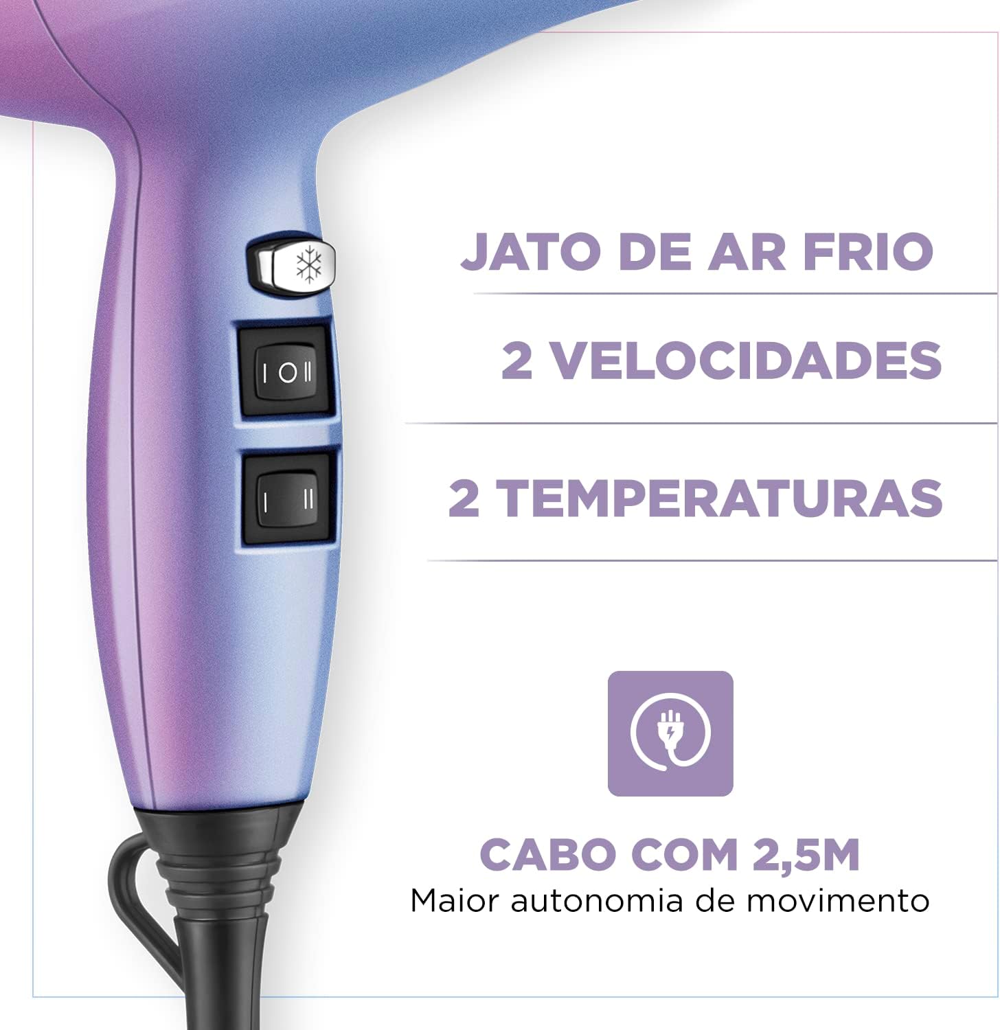 2 VELOCIDADES + 2 TEMPERATURAS: Alterne entre as variações de velocidade e temperatura para uma secagem mais adequada aos diferentes tipos de cabelo.